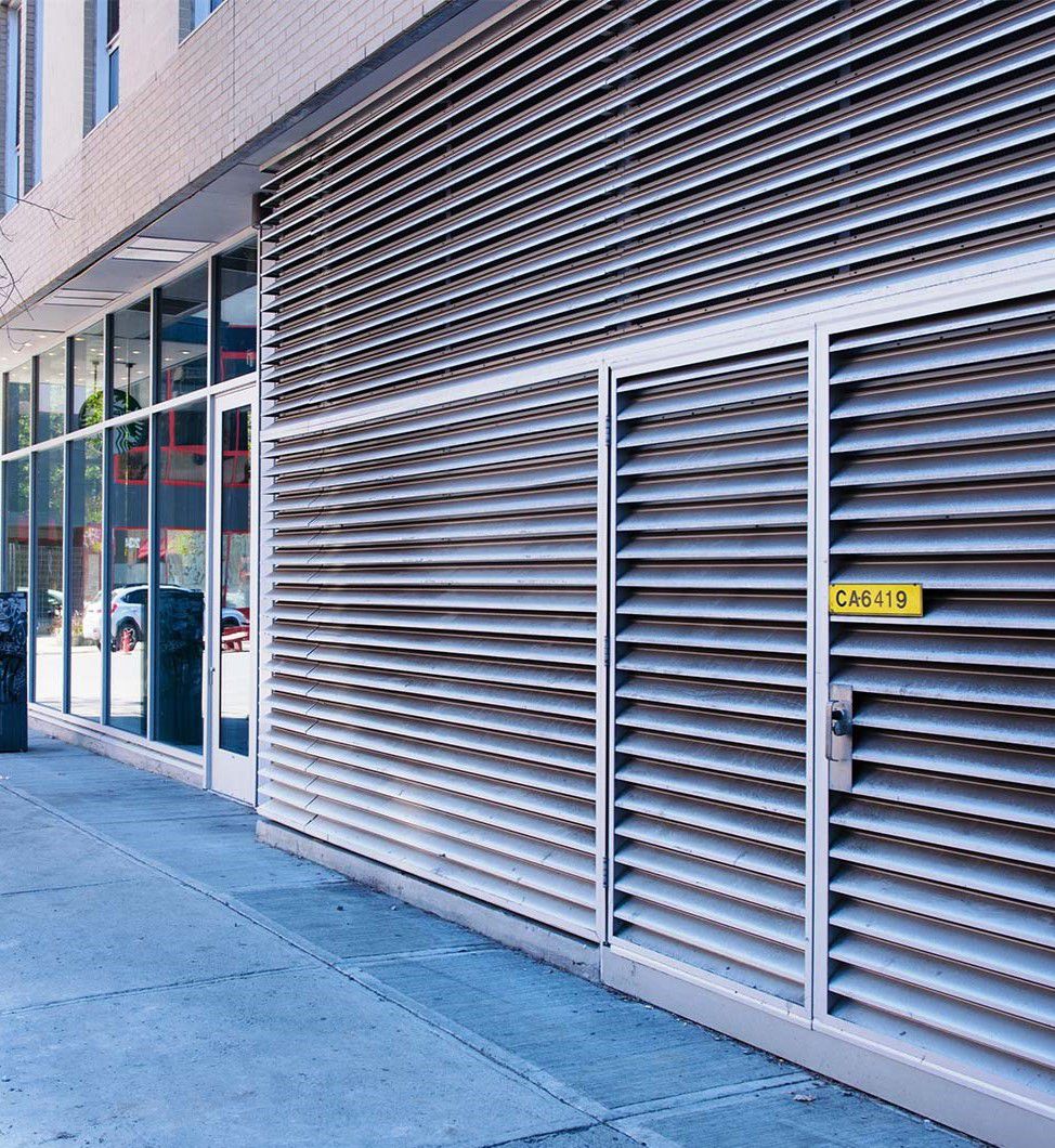 The louvers were designed and assembled with inversed blades to hide the mechanical equipments on the rooftop.